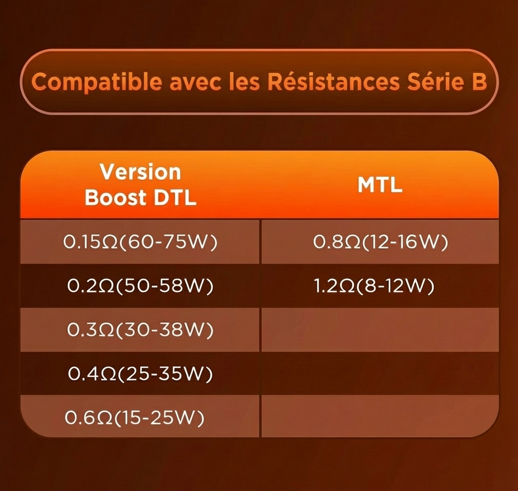Polyvalence et Performance (B-Series) Que vous aimiez le tirage serré ou les gros nuages, le Kit Force répond présent. Grâce à sa puissance de 80W et sa compatibilité avec les résistances B Series (les mêmes que le Zeus Nano ou l'Aegis Boost), il offre une restitution des saveurs exceptionnelle.
